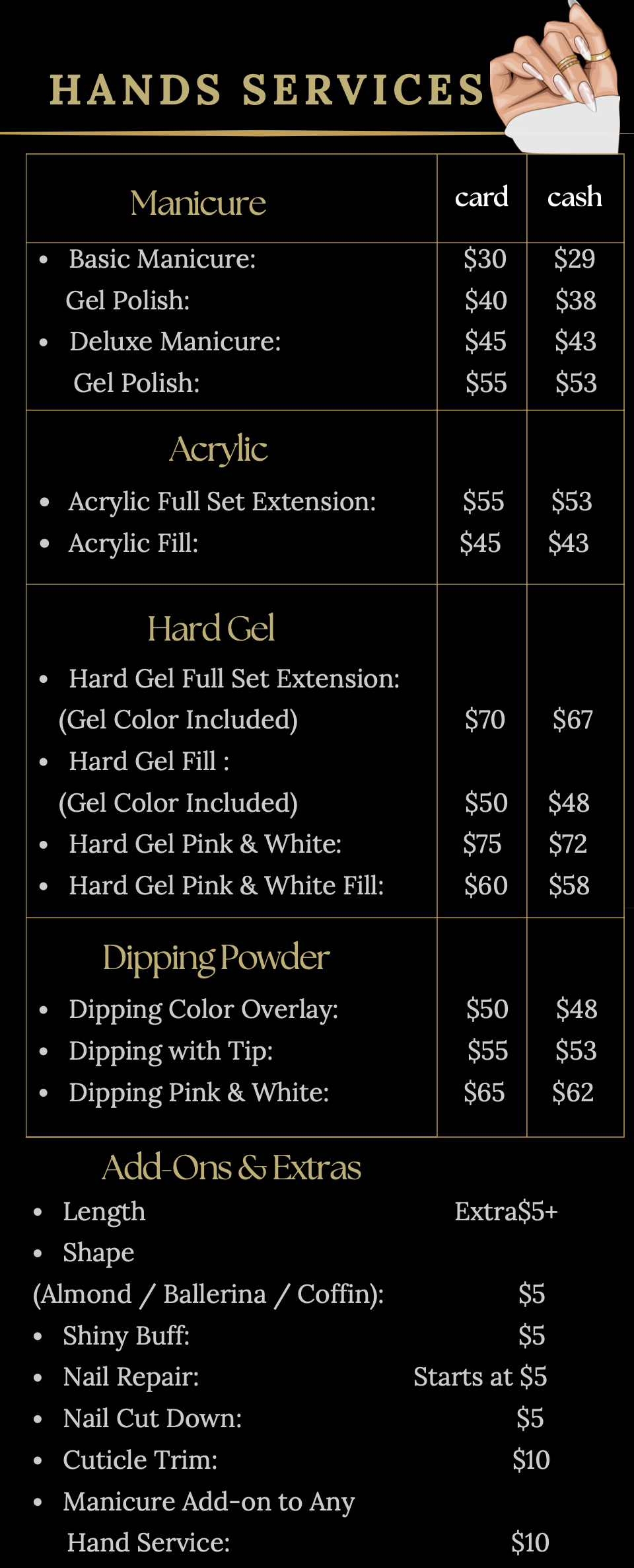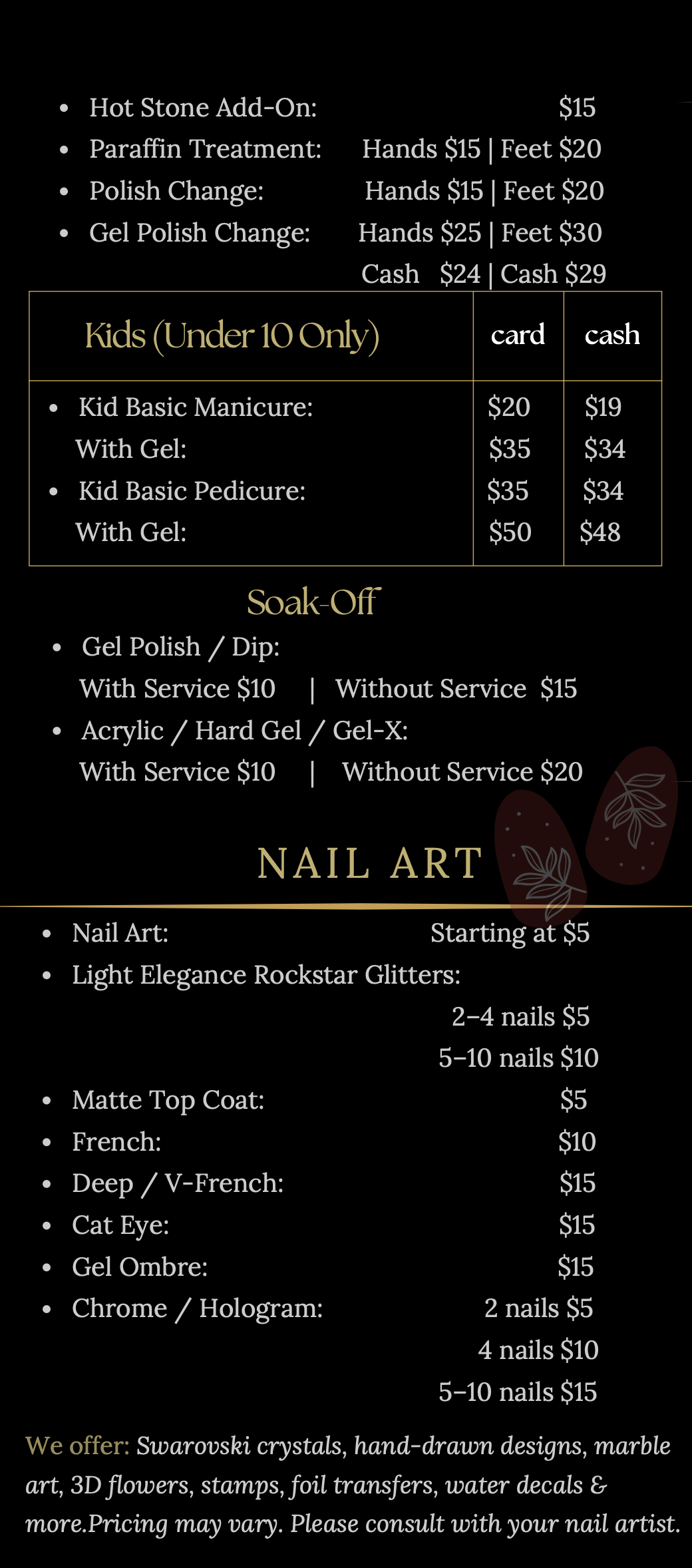 We bring artistry and elegance to your fingertips. Our talented team is dedicated to creating beautiful, distinctive nail designs that reflect your individuality, while ensuring a luxurious and relaxing experience.